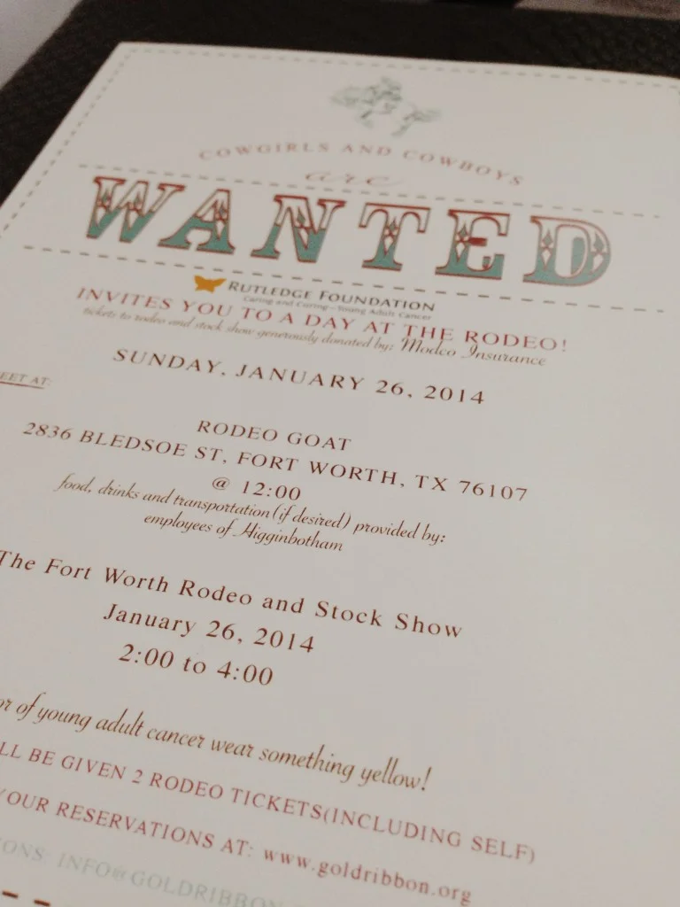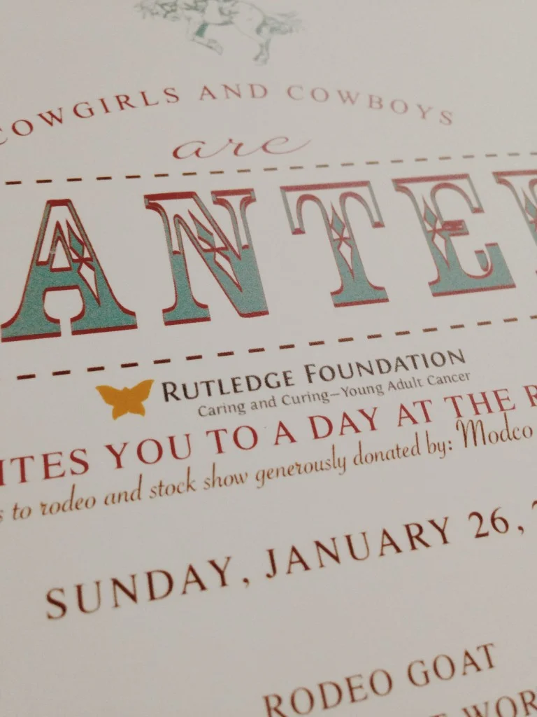 I recently created this invitation for a client and I really loved the way it turned out. The custom invitation was for an event hosted by Rutledge Foundation, a day at the rodeo honoring young adults suffering from cancer as well as those who have survived. Being so close to someone affected by this horrible disease, working with Rutledge Foundation has been just incredible. This foundation has opened my eyes and my heart to becoming proactive instead of falling victim to something like young adult cancer. Rutledge Foundation is the voice to this forgotten demographic of cancer patients and survivors, working diligently to raise awareness of what this disease is doing to our youth as well as funds to further research for the cure that not only allows them to survive cancer, but live a long and much deserved life beyond treatment. I love getting to create for them, and I hope to share more work in the future because they sure are doing great things.